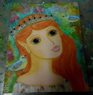 I work with Acrylics, Neo Color Crayons, Watercolors, watercolor pencils and anything else I can get my hands on. If I'm doing a whimsy gal I'll just draw her on my substrate. Sometimes this takes hours. Then I use my Neo Color crayons and block in her face. I use a real watery glaze of Titanium white next and then after that I just do my shading. It's a very minimalist approach compared to other artists.